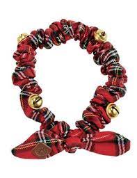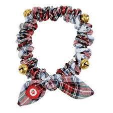 Elastic tartan covered dog collar features dimensional bow, gold jingle bells and faux leather or canvas accent detai