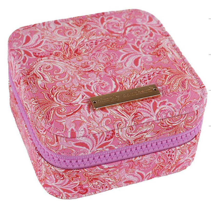This Pink Paisley Print jewelry box is the perfect place to store your jewelry at home or throw in a suitcase for travel. Featuring soft interior, ring, earring, and necklace storage with an interior mirror, gold hardware and Simply Southern logo. Made of 60% PVC 40% polyester.