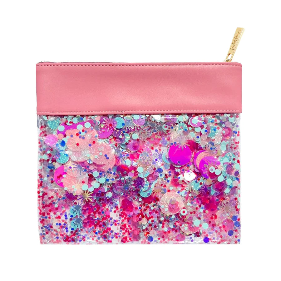 Take a little sparkle with you wherever you go thanks to this heavy duty vinyl pouch we designed that's packed with festive colorful confetti! The perfect bag to serve as an everyday pouch, purse companion, or pencil pouch is this must-have for any and all occasions. Pair it with our matching keychain wallet for the ultimate set that brings the fun!