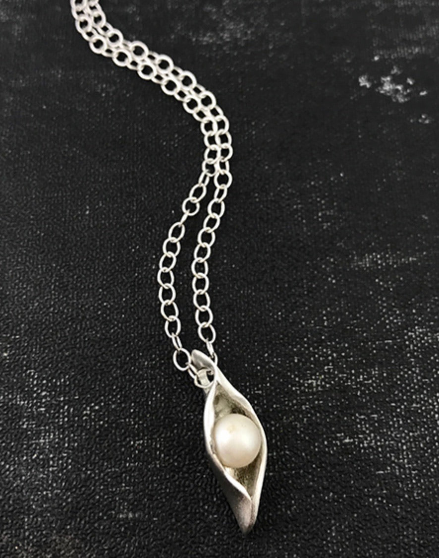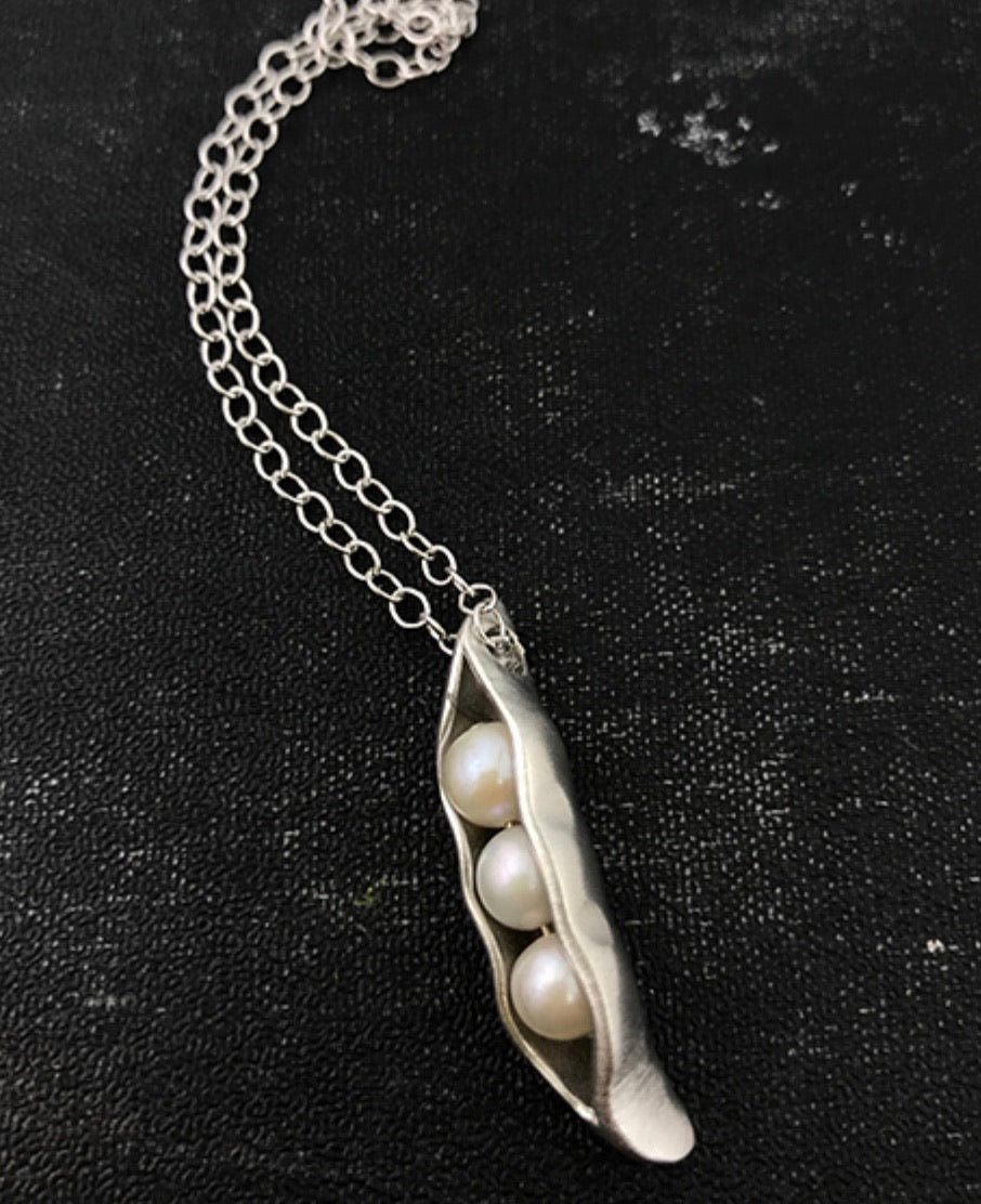 Hand sculpted pea pods were hand cast in fine pewter with a single freshwater pearl "sweet pea" inside, resembling your child.