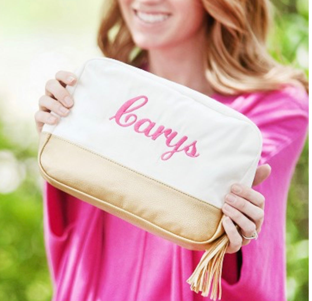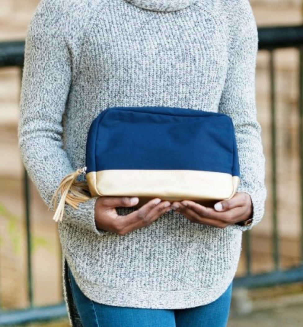 A Cosmetic Bag with class, this zippered bag comes in durable canvas for reliable on-the-go toting. The metallic, vegan leather bottom and tassel add a fun touch to this fabulous essential!- 10"" L x 2.5"" W x 7"" H